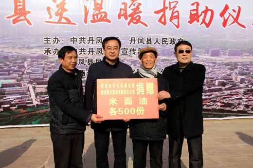 2018年元月12日,陕西粮农集团携手陕西长安书画研究院,共同为陕西省商洛市丹凤县贫困家庭和环卫工人捐助500份价值5万余元的米、面、油。陕西日报、陕西传媒网参加了捐赠仪式。
