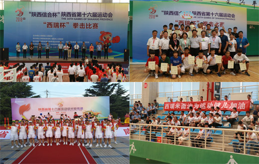 省十六运会的竞赛时间从5月份拉开帷幕。8月3日,西瑞集团以支持公益为初心冠名的“西瑞杯”拳击比赛在兴平市中航工业电源体育馆正式开赛,集团副总经理高增红出席了开幕式,带领集团干部职工组成的30人方队为运动健儿加油助威。7日下午,集团副总经理何五龙作为冠名单位代表参加了“西瑞杯”拳击比赛的颁奖仪式,亲手将荣誉和奖杯送到获奖拳击手的手中,鼓舞他们怀揣运动精神朝着梦想奋勇前进。9日,西瑞集团代表杜娜作为火炬传递手参加了省十六运兴平站的火炬传递,为主火炬塔的点燃传递了象征着和平、友谊、光明和希望的圣火。