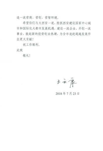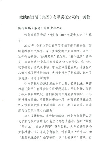 10月10日上午,西安市农林委组织的“西安市农业龙头企业50强授牌仪式暨龙头企业负责人培训会”在西安市佳恒富都酒店举行,西瑞集团被中共西安市委、西安市人民政府授予2017年度“龙头企业”荣誉称号,喜获西安市委书记王永康致陕西西瑞(集团)有限责任公司的一封信。