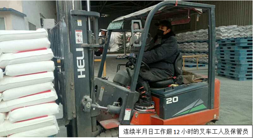 战寒冬,保供给,为了每位客户都能及时拿到产品。面粉公司车间全体人员已月余未休假,寒冬天气叉车司机室外连续工作日均超12小时,但他们从没有半点怨言。叉车师傅说:“冷确实冷了些,但是这么多的客户、老百姓过年需要啊,再冷也得挺住”。