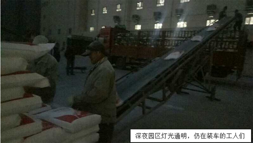 直到深夜,依然清晰可见兴平园区灯火通明,那是装车工人为了让远途客户尽早装车返程而在拼力干活,有时候订单多,任务重,他们一天只吃一顿饭,甚至顾不上喝一口水。