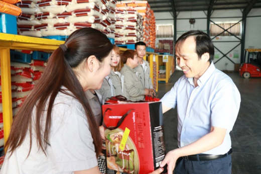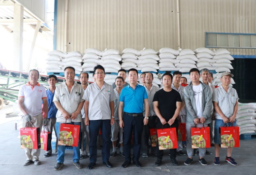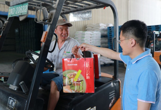 在忙碌的面粉成品库外,集团副总经理何五龙、面粉公司总经理李秦宏、集团团委书记张朋江将装满浓情蜜意的粽子礼盒送到库房保管员、装卸工、叉车司机等19名工作人员手中,详细询问了他们的工作情况,叮嘱他们“认真工作,快乐生活,开心过节”。