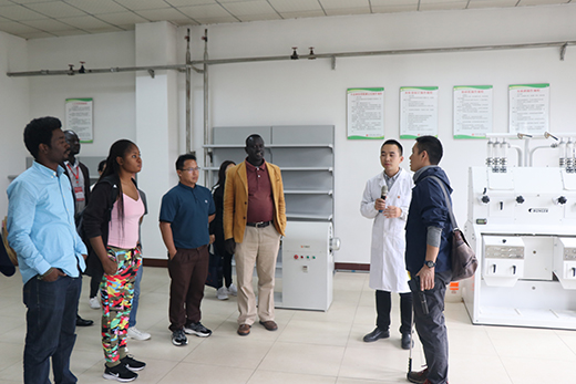 10月11日, 来自老挝、哈萨克斯坦、埃塞俄比亚、古巴等国家的14名在河南工业大学粮食培训学院参加培训学习的厂长经理职业人员,在河南工业大学粮食培训学院王雨薇主任的带领下来到西瑞兴平园区参观交流。西瑞集团副总经理陈俊刚陪同参观并座谈。