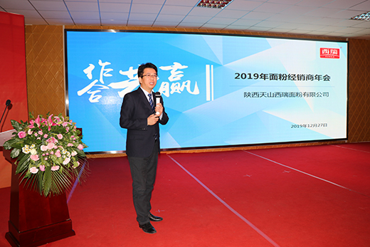 西瑞集团副总经理何五龙作了“风雨同舟,携手共赢,合力开创西瑞面粉事业新辉煌”主题讲话。讲话从四个方面总结回顾了2019年度面粉板块销售工作,对2019年度面粉销售工作取得的成绩给与了充分的肯定。他表示,2020年西瑞集团面粉版块将以“增品种,提品质,创品牌”为支撑,从“用产品说话”、“用团队保障”、“用业绩亮相”三方面对未来一年面粉销售工作努力和发展方向作了规划。