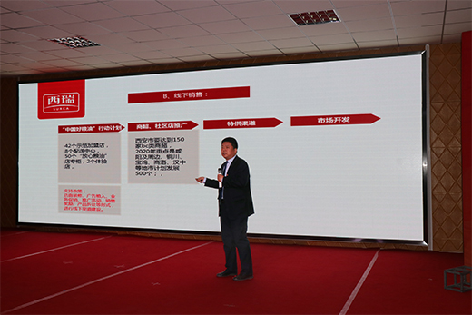 面粉公司总经理李秦宏作了2019年工作报告,从企业发展目标,行业发展趋势,产品研发能力,提升品牌建设等方面对2020年西瑞面粉公司的全面工作做了安排和部署。他表示,西瑞面粉公司将充分展现综合实力,努力做西部面粉加工行业的领跑者,与各位经销商勠力同心,共同发展。副总经理李向阳、副总经理杨军社分别从新品推广、产品特点、销售策略、渠道建设、产品销售、售后服务等方面对西瑞面粉进行了全方位,多层次的推介。最后,西瑞面粉公司对2019年度优秀经销商进行了表彰,并为他们颁发奖项。