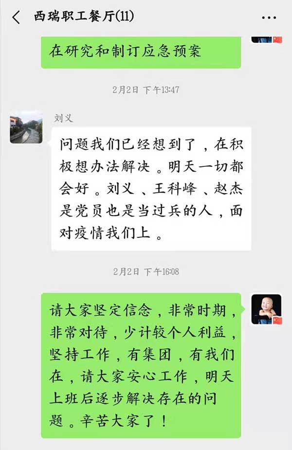 守护健康,职工就餐保障用心思。餐厅克服人手少、任务重等困难,制订并完善《西瑞集团职工餐厅防控新冠病毒应急预案》,联系供货商保障餐厅原料供应,奔赴宝鸡购买一次性饭盒,用餐方式从错峰用餐调整为专人领取盒饭,建立职工餐厅工作管理、应急就餐微信管理群,及时统计园区复工人员就餐信息,确保饮食安全。