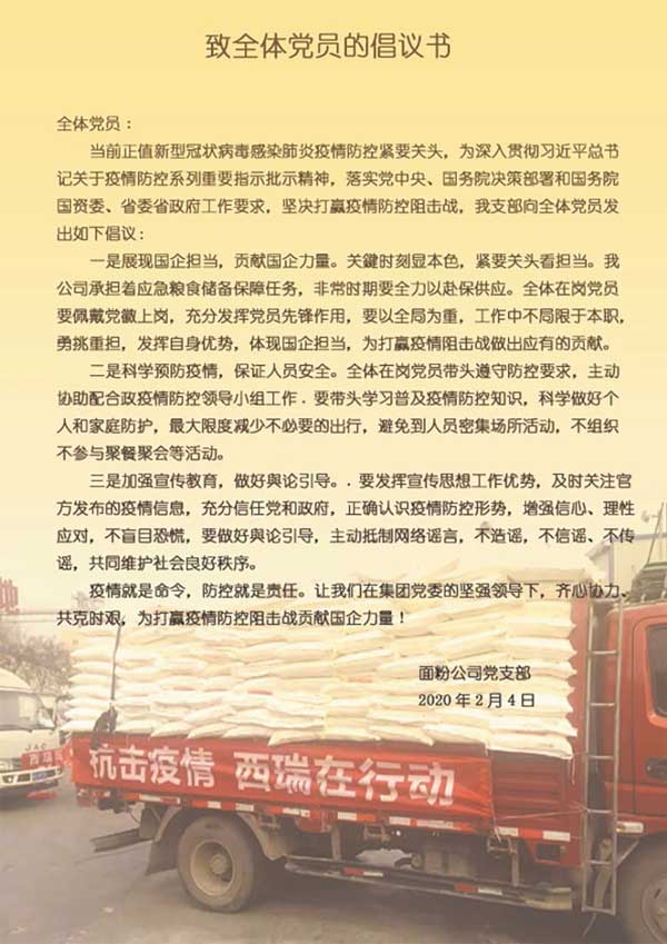 道路封阻致使中小包装短缺,李秦宏同志集思广益、变通应对,通过生产应急编制袋解决包材不足,保障了市场供应。在他的带领下,西瑞面粉公司全体上下拧成一股绳,抗疫保供扎实开展,现场热火朝天,忙而不乱。