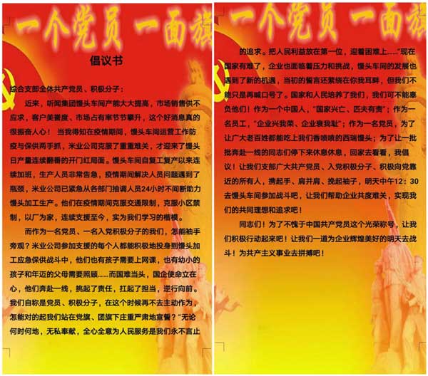 面对疫情防控和保供生产多重考验,综合党支部在得知馒头车间加工人手紧缺的情况下,主动担当作为,迅速发出倡议,号召党员同志和积极分子前去支援馒头生产。《倡议书》在党员群和入党积极分子微信群里一发出,大家立刻回复,清一色都是“我报名”。大家积极响应、踊跃报名的举动表明了积极向党组织靠近的决心,感动着馒头车间着每一个人。