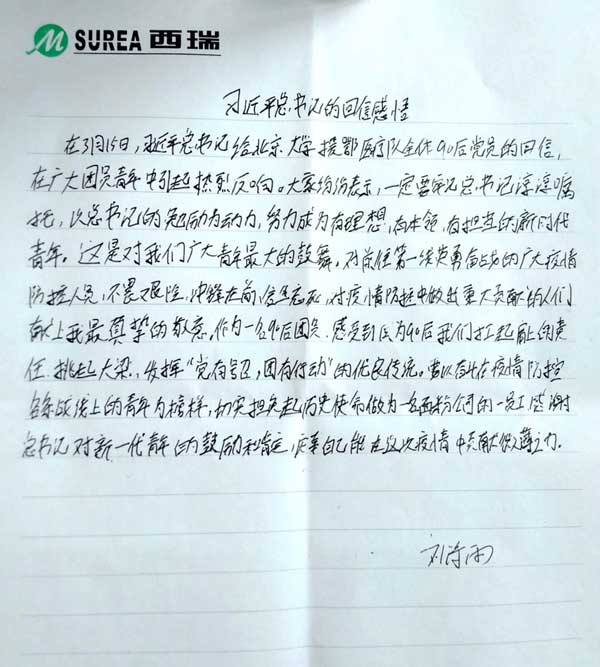 读了习近平总书记的回信,感叹恰同学少年,风华正茂,2003年非典,全世界守护“90后”,2020年新冠,“90后”守护全世界。鲁迅先生曾在文章里写道“我们自古以来,就有埋头苦干的人,有拼命硬干的人,有为民请命的人,有舍身求法的人……”在2020年春新冠肺炎肆虐之时,就是这样一群人主动请战,扛起了抗疫大旗。也许历史不能记录他们的光耀,但我们知道,疫情的胜利,离不开他们的努力—“90后”!做为抗击疫情生产一线的一员,我深深体会到,有国才有家,国家爱我们,我们也爱他,五星红旗就是我们的信仰,抗击疫情是我们西瑞人的职责,更是一种使命与担当。