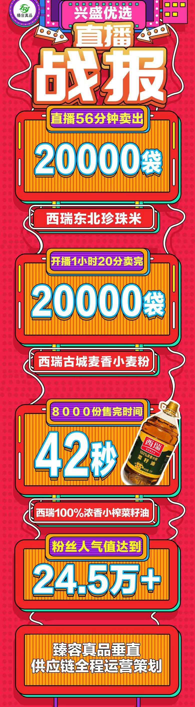 两个半小时的直播,观看人数达到14.9万人次,参与评论数4009条,点赞35440次,共销售西瑞面粉31269袋,大米29026 袋,油脂 20246 桶,销售额2023419.2元,刷新了平台粮油产品销售记录。