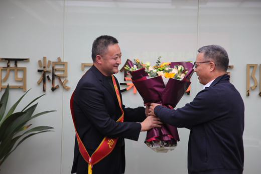 刘利民代表粮农集团为李德伟佩戴绶带,送上鲜花。