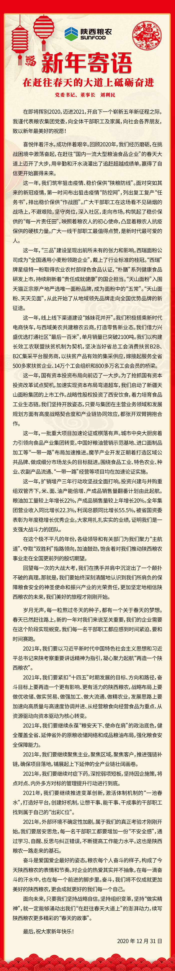 粮农集团党委书记、董事长刘利民寄语新年:在赶往春天的大道上砥砺奋进!