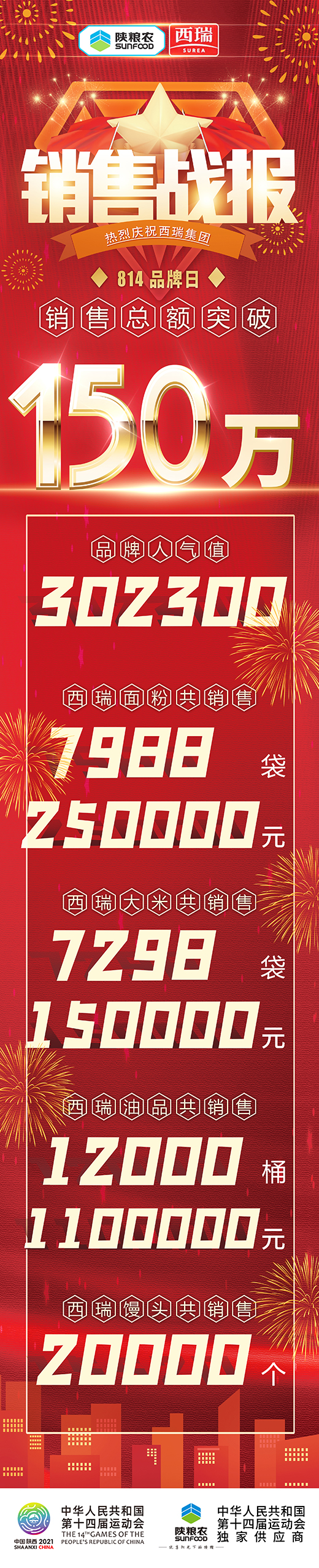 本次活动线上品牌人气值达302300,西瑞品牌不断走进千家万户,品牌日销量用数字诠释了西瑞产品在消费者心中的认可度。西瑞集团将继续不忘初心,履行“国企责任,健康品质”的承诺,用优质、放心的产品回馈广大消费者。
