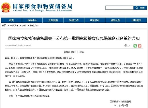 据了解,按照《粮食应急保障企业管理办法》(国粮仓规〔2021〕193号)有关规定,国家粮食和物资储备局按程序认定中粮集团有限公司等68家企业为第一批国家级粮食应急保障企业。公布的国家级粮食应急保障企业平时按市场化运作,自主经营;粮食应急状态下,要服从国家粮食和物资储备局统一指挥和调度,保证粮油的应急加工和销售,保持必要的粮油库存量,切实做好粮油供应配送工作,确保粮油供应充足、质量良好、价格稳定。