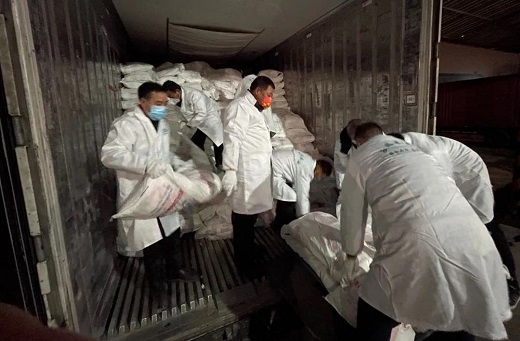 24日下午的任务是要将250吨货品通过从大货车上卸货、再装货到10多辆小车中,最后送至各超市和高校。突击队的队员们团结一致、通力合作,历经7小时终于完成装卸工作,结束已是25日凌晨2点。