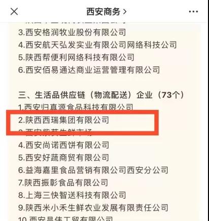 12月29日,西安市商务局发布了第三批商贸领域市场保供重点企业名单,西瑞集团位列其中。