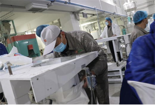 在面粉生产车间打包生产线,队员们分成两组,一人一个岗位,套袋、封口、装袋、整形、码垛,男女队员齐上阵,老队员现场教学、技术指导,新队员从“零”起步,他们中不少是“95后”,没有经验就学技巧,女队员力气小那就帮忙整理打包袋,眼镜片被面粉糊上、满身面粉也没有一个人叫苦叫累,只是时刻关注着流水线上的每一袋合格产品从指间流过,送往成品库房。
