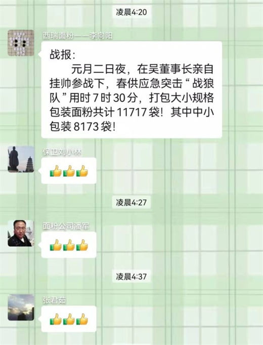 时值深冬,作业现场寒意愈浓,队员们虽然满身疲惫、一身素装,但首尾呼应、秩序井然,偶尔还传来欢声笑语。3日凌晨4时许,集团微信交流群内传来捷报,“战狼队”用时7时30分,打包大小规格包装面粉共计11717袋!其中中小包装8173袋!
