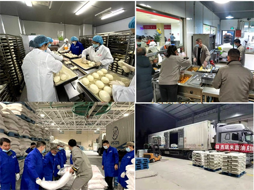 作为粮食人,我们开辟销售供应前沿阵地,努力让西安市民消除恐慌心理,确保人民群众“手里有粮、心里不慌”,面对物流配送、装卸人员紧张难题,组织青年职工成立应急保供突击队,连夜转运250吨米面油至西安多所高校、超市及社区。同时与各大企业、供应链公司联系快速投放粮油产品,确保市场粮油产品产得出、供得上、货足价稳。截止1月5日,累计投放西瑞面粉10000余吨,大米1500余吨,油脂130余吨,馒头35万个。