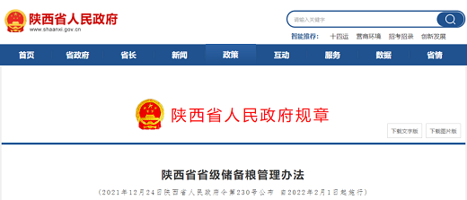 (《陕西省省级储备粮管理办法》已经2021年12月13日省人民政府第36次常务会议审议通过,自2022年2月1日起施行。)