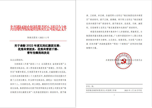 近日,粮农集团下发《关于表彰2022年度五四红旗团支部、优秀共青团员、优秀共青团干部、青年先锋岗的决定》。西瑞集团王佩荣获“粮农集团优秀共青团干部”荣誉称号,任延峰荣获“粮农集团青年先锋岗”荣誉称号。