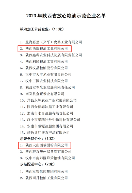 为认真贯彻落实国家粮食安全战略,深入推进我省优质粮食工程建设,促进粮食行业高质量发展,省粮食行业协会进行了2023年省级放心粮油示范企业认定工作。经初审推荐,省粮食行业协会组织专家综合评审和公示,20家企业被认定为陕西省放心粮油示范企业。其中,西瑞集团所属陕西西瑞粮油工业有限公司入选粮油加工示范企业,陕西天山西瑞面粉有限公司入选示范仓储企业。