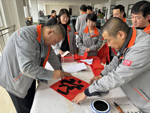 为增添新春节日氛围,集团开展“迎新春•送祝福”活动中,喜欢书法的领导和职工一起挥毫泼墨,一幅幅火红的春联、一张张福字深受大家喜欢。干部职工或围在旁静观书写,或细看文字品评春联寓意,或精心挑选着心仪的对联,浓浓的年味扑面而来。